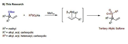 具体探索过程如图4。该团队以叔烯丙基碳酸酯1a与苯亚磺酸钠2a为底物,Mo(CO)6为催化剂,2,2’-联吡啶为配体,EtOH为溶剂,在60 ℃下反应24 h即可获得高产率及高区域选择性的目标产物。
