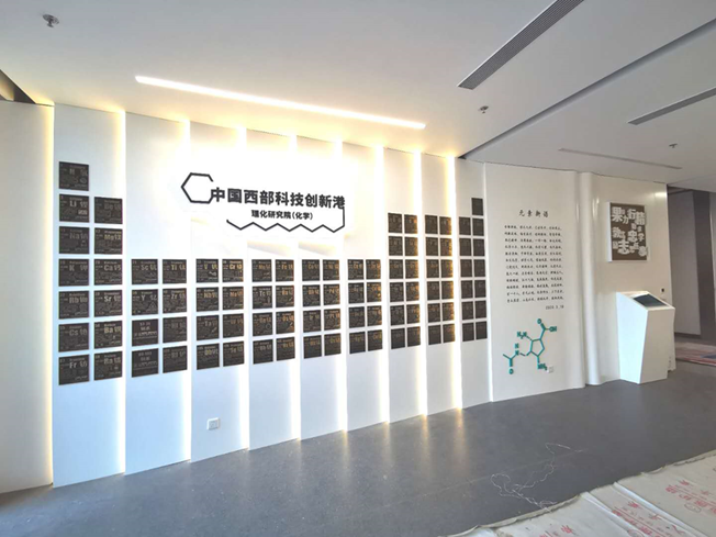 文化元素的具象化方面学院着力突出化学学科的特有化学元素和特征,并在此基础上凝练出文化意象,同时融合平面设计、交互式新媒体等表达手段,坚持艺术性与实用性的有机统一,从而实现综合式教学科研空间全方位、立体化和实时性呈现。其中在化学研究院一层正东走廊,设计“学科分析测试平台”走廊区域,悬挂介绍展板并设置液晶显示屏,介绍各台(套)仪器的功能、使用规范,显示设备3D影像、设备预约情况。在二层正东走廊两侧悬挂研究概况展板,介绍各科研平台及研究所的研究方向、研究成果和相关成员信息。在二到五层正东走廊中部放置交互式电子屏,滚动播出各研究所相关方向科研进展和成果等科研动态。在四层还设计建设了校企合作展示区,基于学院办学理念、育人模式、产教融合、成果转化、企业文化等方面对校企合作进行综合展示。同时,在五层也建设了多功能教工之家,布置风格温馨的教工风采展示区作为党务、会议、培训等工作的开展场所。在各楼层公共区域放置了沙发、跑步机、乒乓球台等休闲、锻炼设施,供师生工作间隙放松身心,营造轻松愉快、团结合作的工作氛围。