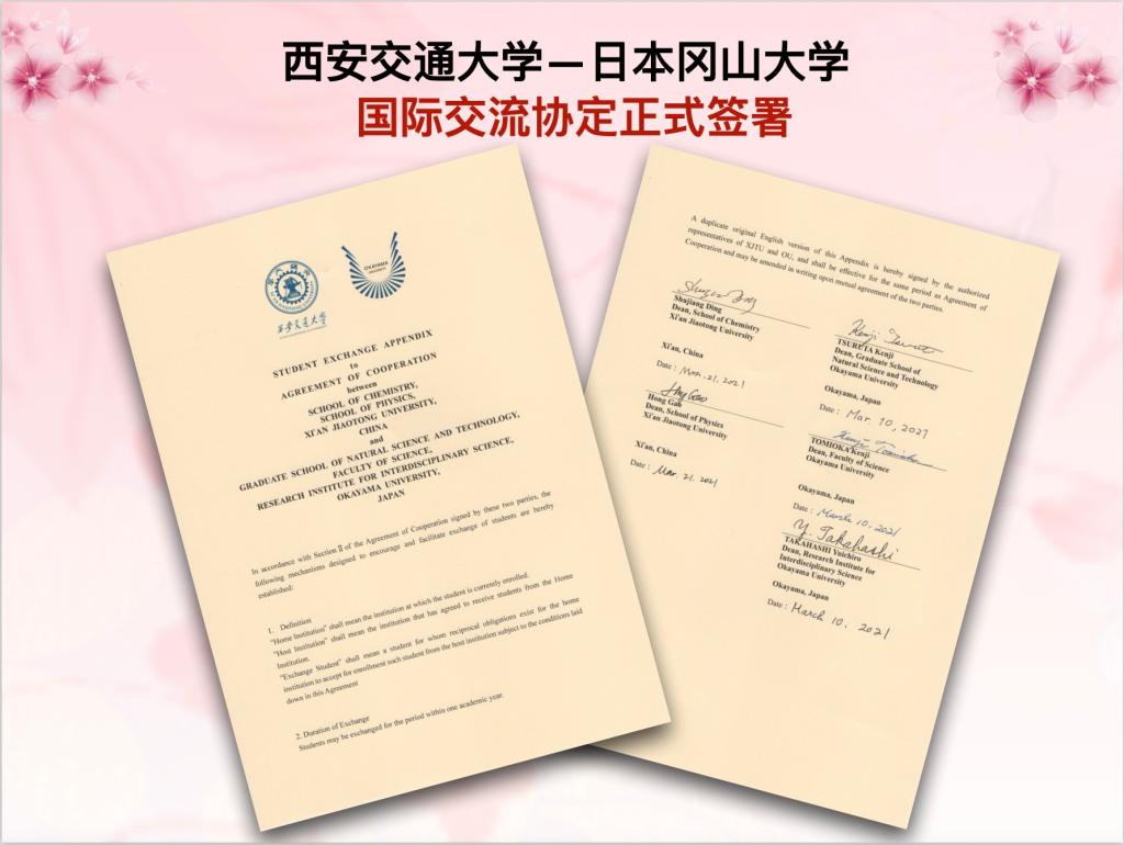 为培养适应社会需求的国际化人才,全面推进交大理学类学生教育培养的国际化进程,我院携物理学院与日本冈山大学的理学部、大学院自然科学研究科、异分野基础科学研究所这三所科研院所,于3月21日签署了西安交通大学-日本冈山大学院系合作交流协议。