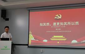 在讲党史环节,韩言博同志认为,学习党史应当“知其然,更知其所以然”。他针对为什么要学习党史、为什么产生了中国共产党、中国共产党如何经住了大浪淘沙等问题展开了详细的论述,并向大家推荐了献礼片:《觉醒年代》、《大浪淘沙》、《理想照耀中国》等优秀影片,为同志们更好地学习和理解党史提供了可视化的资料。借由《矛盾论》展开了党的具体工作介绍,讲述了中国共产党成立以来的探索历程,强调了中国共产党探索路线的正确性,无数相对真理汇聚成绝对真理,实践出真知,历代共产党人以实际行动践行中国特色社会主义。韩言博同志还由浅入深地介绍了中国共产党为什么“能”,马克思主义为什么“行”,中国特色社会主义为什么“好”等相关问题,并和大家展开热烈讨论。