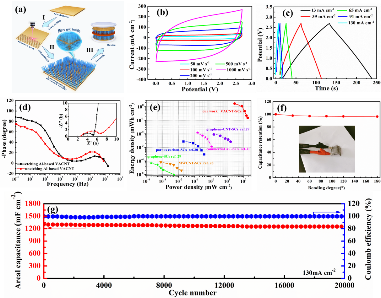 针对这一问题,必赢唯一官方网站杜显锋教授团队采用激光刻蚀技术结合化学气相沉积法设计并制备了一种具有多级结构的铝微栅阵列碳纳米管(VACNTs)电极,与通过传统涂布方法制备的CNTs电极相比,Al微栅VACNTs电极具有更高的活性材料负载量(13 mg cm-2)、与集流体之间结合较好,并且表现出优异的电化学性能。当电流密度为13 mA cm-2时,电极的面容量高达1,300 mF cm-2;而且在高电流密度下(130 mA cm-2)循环20,000圈后容量保持率为90%以上。此外,由于集流体与活性材料之间具有良好的机械强度和柔韧性,在多次多角度弯曲后仍然表现出良好的性能。该项研究结果表明具有多级结构的Al微栅VACNTs电极在高性能、柔性和可穿戴超级电容器储能器件领域具有良好的应用潜力。