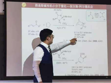 从上世纪末以来,Benjamin List教授和David MacMillan教授相互独立地开发了基于有机小分子的不对称有机催化这一新型催化反应。因此在随后环节,杨老师从同学们熟悉的“D-A反应”、“Micheal加成反应”入手,带领大家详细梳理了两位诺奖得主的代表性研究以及他们的研究历程。同时他也穿插介绍了其余研究人员做出的重要工作,让大家对于这一领域的研究成果有了更加全面和深刻的认识。