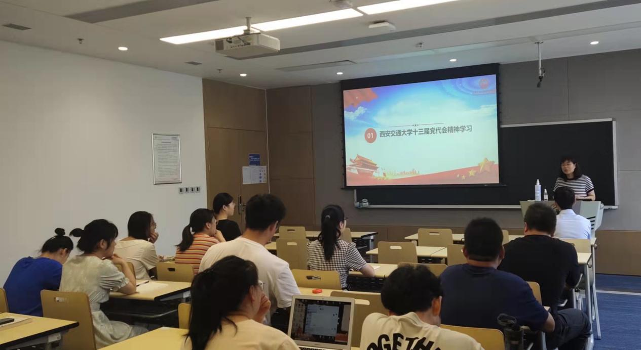 首先,必赢唯一官方网站党委常委梁军艳老师带领大家学习了西安交通大学十三届党代会精神。梁老师介绍了大会主题是高举习近平新时代中国特色社会主义思想伟大旗帜,深入学习贯彻党的十九大和十九届历次全会精神,全面贯彻习近平总书记来校考察重要讲话精神,牢记为党育人、为国育才使命,落实立德树人根本任务,胸怀“国之大者”, 弘扬西迁精神,勇担国家使命,共创交大荣誉,加快建设中国特色世界一流大学,以实际行动坚决拥护“两个确立”、坚决做到 “两个维护”,为全面建设社会主义现代化国家做出更大贡献。梁老师还介绍了我校第十二次党代会以来的主要工作及取得成绩,宣传了我校未来五年的任务目标以及方案措施。分享结束之际,梁老师呼吁大家站在新的发展起点上,要更加紧密地团结在以习近平同志为核心的党中央周围,弘扬西迁精神,勇担国家使命,共创交大荣誉,为实现第二个百年奋斗目标、实现中华民族伟大复兴的中国梦做出新的卓越贡献。