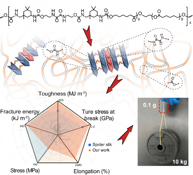 近日,西安交大必赢唯一官方网站张彦峰教授团队采用无溶剂聚合的方法,通过聚己内酯二醇(PCL)、二异氰酸酯(IPDI)和N,N-双 (2-羟乙基)草酰胺(BHO)反应制备出了具有极高机械强度和韧性的可生物降解聚氨酯弹性体。这种弹性体结构中丰富的氢键相互作用阻碍了PCL段的结晶,促进了在弹性体内部形成均匀分布的硬相微域。通过对弹性体内部氢键相互作用和分布的进一步优化,奇迹般地实现了极高的强度(92.2 MPa的断裂强度、1.9 GPa的断裂真应力)和韧性(480.2 MJ·m-3)以及前所未有的高断裂能(322.2 kJ· m-2),加之良好的生物相容性和降解性,可通过3D打印技术制成疝气补片应用于生物医学。此外,就机械性能而言,该弹性体在柔性电子、缓冲吸能等方面同样具有很大的应用潜力。