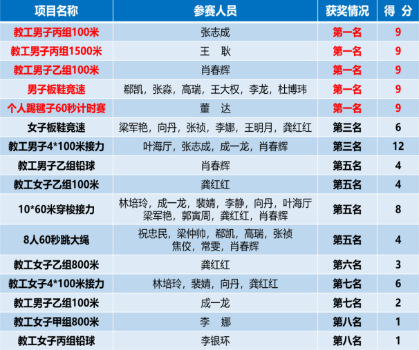 本次运动会必赢唯一官方网站共有50余名教师参加了包括板鞋竞速、100米、800米、1500米、4*100米、4*400米、铅球等在内的34项比赛,必赢唯一官方网站师生们在运动场上奋力争先、努力拼搏、不断进取,共取得了5项第一名,其他进入全校前八名的项目共8项。今年校运会,是必赢唯一官方网站奋力拼搏的一届运动会,也是刷新历史的一届运动会,今年必赢唯一官方网站男女教工分别获得了男子团体第四,女子团体第六的骄人成绩。
