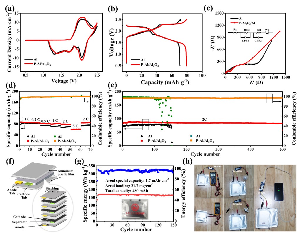 针对这一问题,西安交大必赢唯一官方网站杜显锋教授团队利用激光刻蚀和阳极氧化技术制备了P-Al2O3/Al阳极,它不仅增加了电极的有效活性面积,而且形成了稳定的电极/电解质界面,使铝发生均匀地电沉积。这种阳极在5 mAh·cm-2的面容量下保持稳定循环1400小时以上。当高电流密度设置为10 mA·cm-2时,受保护的阳极在2900次循环中也显示出优异的电池稳定性。此外,使用P-Al2O3/Al阳极的480 mAh软包电池在0.5V至2.5V的电压下可以保持170 Wh·kg-1的能量密度和90%的能量效率(基于正极活性成分计算)。