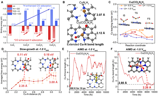 A) CO和H在不同基底上的结合能。 B) CuN4H3和Cu(CO)2N4H3的优化结构。 C) 在U = - 0.5、-1.0和-1.5 VSHE时Cu(CO)2N4H3上的Cu溶出势垒。 D) 通过“Slow-growth”方法计算得到Cu(CO)2N4H3在-1.0 VSHE时Cu-(CO)2结构溶出过程中的总自由能结果。E) Cu(CO)2N4H3在10 ps的恒电位AIMD模拟期间的Cu-N键长。 F) Cu(CO)2N4H3在额外的10 ps期间的Cu-Cu键长。