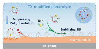 针对这一问题,必赢唯一官方网站丁书江团队首次揭示了富氟SEI的溶解是造成界面不稳定的原因之一并提出抑制富氟SEI溶解的策略。在水系锌离子电池基底电解液中引入1,4-噻噁烷(TX)添加剂可减缓含氟组分(如ZnF2)的溶解并稳定富氟SEI层。一方面, TX调节水溶剂的极性,有效降低ZnF2的溶解度;另一方面,TX可以在电极/电解质界面形成较强的化学吸附并优化Zn2+溶剂化壳结构,降低局部水分子的活性,进一步阻止ZnF2溶解到电解质中,增强金属锌阳极的稳定性。作为概念验证,改性电解液制备的Zn||KVOH全电池展现出优异的循环稳定性,即使在高负载和贫电解质条件下也具有出色的容量保持率,满足了实用锌离子电池对高能量密度的需求。本研究为解释锌阳极失效提供了一个全新的视角,为后续人工SEI层的构建和电解质设计提供了有益参考。