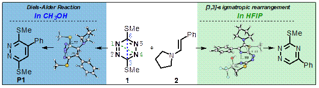 在有机化学中,含缺电子杂环偶氮二烯的反电子需求Diels−AlderiEDDA)反应是合成多官能化杂环的一种有效方法。该反应目前已被广泛应用于生物正交偶联、天然产物全合成、金属有机框架修饰、碳纳米管功能化以及微阵列的构建等方面。这些反应通常在甲醇等溶剂中沿碳碳轴,通过Diels-Alder环加成(C3/C6环加成)的历程进行,生成一系列二嗪化合物。令人惊讶的是当以六氟异丙醇为溶液时,则发生反常的N1/N4环加成得到1,2,4-三嗪产物。迄今为止,六氟异丙醇对这类反应的选择性和路径的影响尚缺乏系统深入的理论研究。