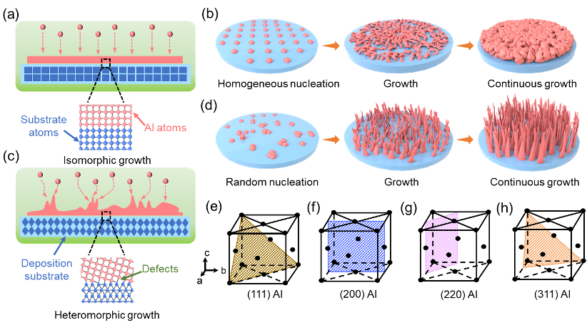 针对这一问题,西安交通大学杜显锋教授等人通过调节铝晶面的择优取向,报道了一种稳定简单的铝电池阳极制备工艺,并证明了具有高晶格匹配的择优晶面生长机制与铝阳极电化学性能之间的相关性。结果表明,这种具有(111)择优晶面的铝阳极在铝的初始成核和生长过程中起着重要作用。用(111Al阳极组装的铝电池具有更稳定的沉积形态和更长的循环寿命,并成功实现了高度可逆的沉积/镀覆、无枝晶和高库仑效率。在5A·g-1的电流密度下,具有(111)择优晶面的铝阳极稳定地进行了25000次循环,容量保持率超过80%。这项工作为高稳定性可充电铝电池的发展开辟了道路,对高安全性储能电池的发展具有重要意义。