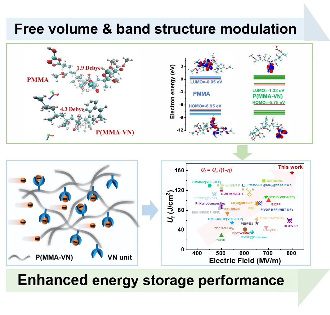 近日,必赢唯一官方网站张志成教授团队联合西安交通大学第二附属医院高登峰教授团队提出了一种创新策略,通过刚性萘环的自由体积与能带结构的协同调控机制,有效解耦偶极玻璃态聚合物中高能量密度与高能量损耗之间的矛盾。研究团队通过将2-乙烯基萘(2-VN)与甲基丙烯酸甲酯(MMA)共聚合,成功合成了一种新型无规共聚物P(MMA-VN)。共聚引入的刚性萘环结构有效增大了甲基侧基的自由体积,提升了聚合物的极化能力,并显著抑制了弛豫损耗。此外,萘环对能级结构的调控引入了陷阱能级,增强了载流子俘获能力,有效降低了漏导损耗以及热击穿与电击穿的风险。当VN含量为5 mol%时,材料的储能性能最优,其在800 MV/m的电场下展现出优异性能,能量密度高达19.3 J/cm³,放电效率超过89%,在绝大数已报道的聚合物基介电材料中处于领先水平。所制备的P(MMA-VN)介电材料在实现高能量密度与高放电效率协同提升的同时,兼具优异的溶液加工性及热/机械稳定性,具备良好的规模化制备潜力,是面向电动汽车、可再生能源系统与柔性电子器件等领域先进电容器的理想候选材料。此外,该设计策略具有较强的普适性,可拓展应用于其他聚合物体系,为开发新一代高性能介电材料提供了通用平台。该研究为提升薄膜电容器的能量存储性能开辟了新路径,展现出在介电能量存储领域的广阔应用前景。