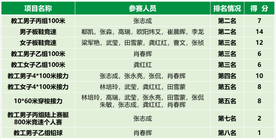 本届运动会上,必赢唯一官方网站教工代表队以“全员参与、挑战自我”为宗旨,派出精锐阵容参与多个项目的角逐。在女子组比赛中,运动员们凭借扎实的体能与灵活的战术,在短跑、接力、跳远等项目中屡创佳绩。本届运动会上,必赢唯一官方网站教工代表队以“全员参与、挑战自我”为宗旨,派出精锐阵容参与多个项目的角逐。在女子组比赛中,运动员们凭借扎实的体能与灵活的战术,在短跑、接力、跳远等项目中屡创佳绩。其中,龚红红老师在教工女子乙组100米决赛中以突破个人最佳的成绩斩获第三名,林培玲、龚红红、武莹、田雪蒙老师带领的4×100米接力队以默契配合稳居小组前三,为团体积分奠定坚实基础。此外,梁军艳、林培玲、李芬、龚红红、曹文、王晓等老师组成的队伍在女子板鞋竞速项目中同样表现出色,凭借出色的协作能力荣获第三名,充分展现了必赢唯一官方网站女教师们团结奋进、勇于挑战的精神风貌。