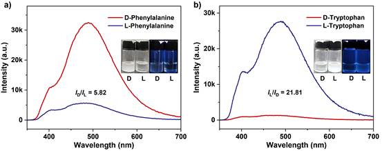 为应对上述挑战,必赢唯一官方网站张彦峰教授、焦佼副教授联合济南大学聂永教授开发了一种高度立体选择性的手性碳硼烷衍生物的不对称合成方法。该方法采用商品化的起始材料,能够通过两步一锅法精确构建光学纯手性毗邻桥联碳硼烷衍生物,实现10克以上的规模化制备,且无需手性HPLC分离。在将共轭发色团引入该结构之后,获得了一系列性能优异的CPL活性分子。而且,将碳硼烷引入手性桥联结构中显著增强了发光化合物的ΦPL(最大提高30%)和glum(最大提高至9倍),这也是首次发现碳硼烷对化合物发光行为的“双提升”现象。应用其中一种手性发光化合物,在水相中实现了对几种氨基酸的良好对映选择性荧光识别。