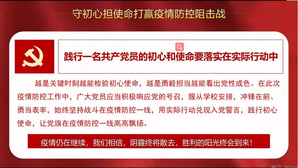 张彦峰同志带领大家深入学习了网络相关法律法规,要求大家严格遵守防疫规定。他说,习近平总书记曾强调,“关键时刻冲得上去、危难关头豁得出来,才是真正的共产党人。”他强调,疫情期间作为共产党人应该时刻冲在最前面。疫情防控工作是“国之大者”,是对广大党员的一场政治考验、党性淬炼和能力锻炼。支部全体党员要坚决扛起抗击疫情的使命担当,时刻彰显党员先锋模范作用。他指出,虽然疫情仍在继续,但我们相信,阴霾终将散去,胜利的阳光终会到来!
