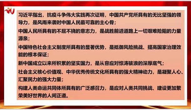 雷鸣新同志带领大家深入学习了伟大抗疫精神,争做西迁新传人。他指出,青年兴,则国家兴。他说,能为此次西安疫情防控阻击战贡献力量,感到无上荣光,苦点累点都不算什么,只希望疫情能尽快结束,大家早日回归安宁的生活!他用图表的方式记录了我们国家抗疫和其他国家的区别。他借用习近平总书记多次在民族复兴的坐标上思考青年责任的话语,“你们这一代青年,参与、见证和推动民族复兴的历程生逢其时。这是青年之幸,也是国家之幸。”,号召大家在这次抗击疫情的斗争中,挺身而出、担当奉献,充分展现化学骄子的精神风貌。