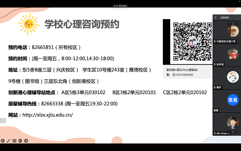 S1199、S1200班心理委员向同学们普及了学校心理健康预约咨询方式,鼓励同学们如果遇到心理问题可以寻求专业帮助,切忌盲目自我诊断。