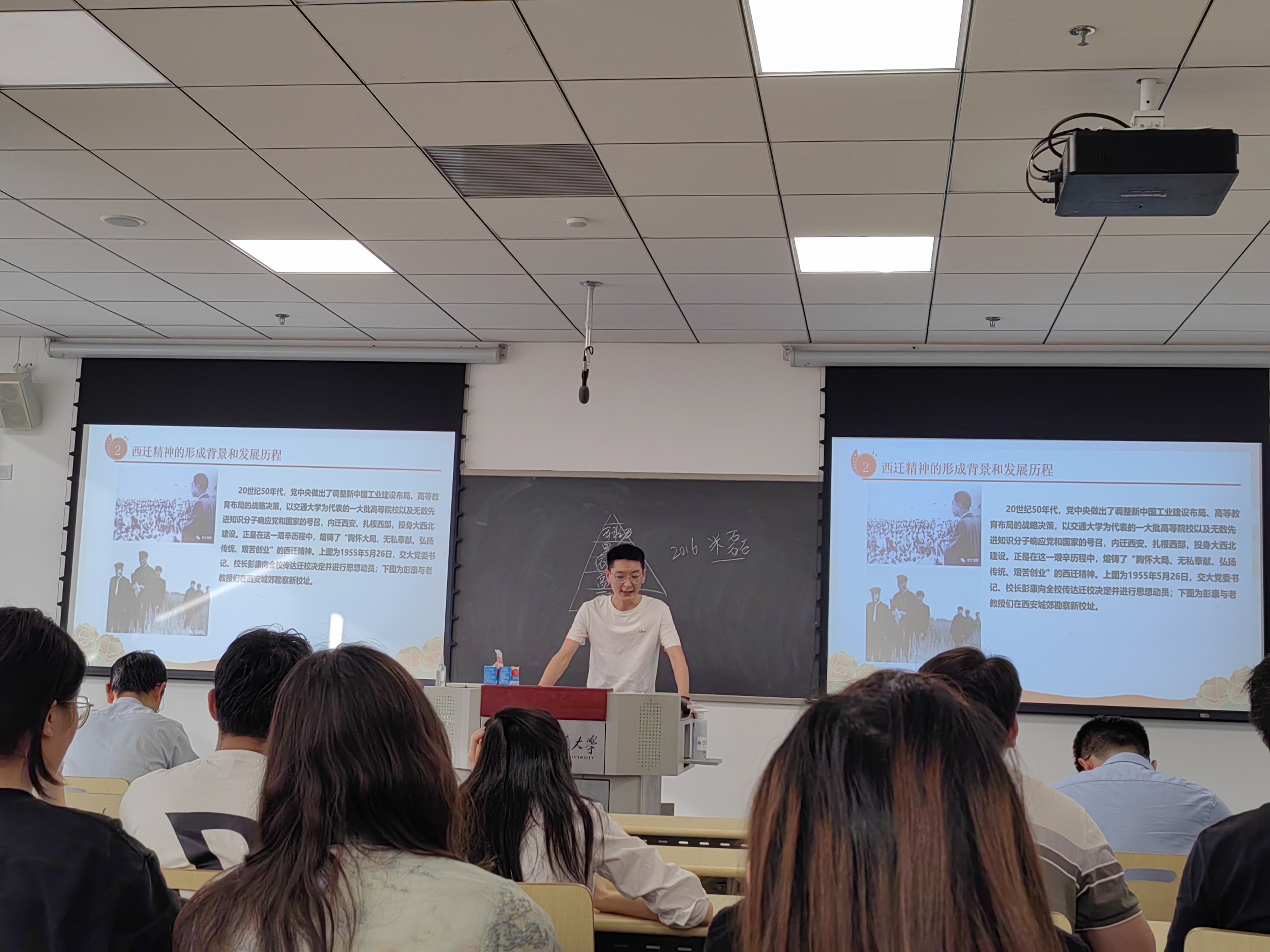 会议第二项,由绿色合成师生联合党支部同志带领重温习近平总书记来校考察重要讲话,通过习近平总书记来校考察时的视频资料,回顾当时的情景,解读习近平总书记的讲话精神,并结合学校实际,思考如何贯彻落实讲话要求。之后通过PPT展示再次学习了西迁精神的时代内涵,感受交大变迁,提醒广大党员同志向老一辈科学家、实干家、革命家学习,践行“西迁精神”,争做西迁新传人。
