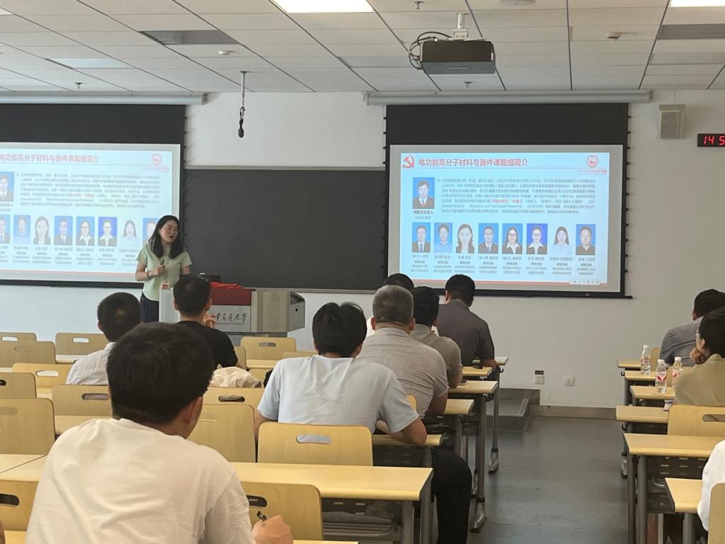 活动第二项,高分子化学师生联合党支部介绍与传感研究进展汇报:智能高分子团队由申锴翔介绍,绿色与功能高分子团队由王淑娟老师介绍,电功能高分子团队由龚红红老师介绍。